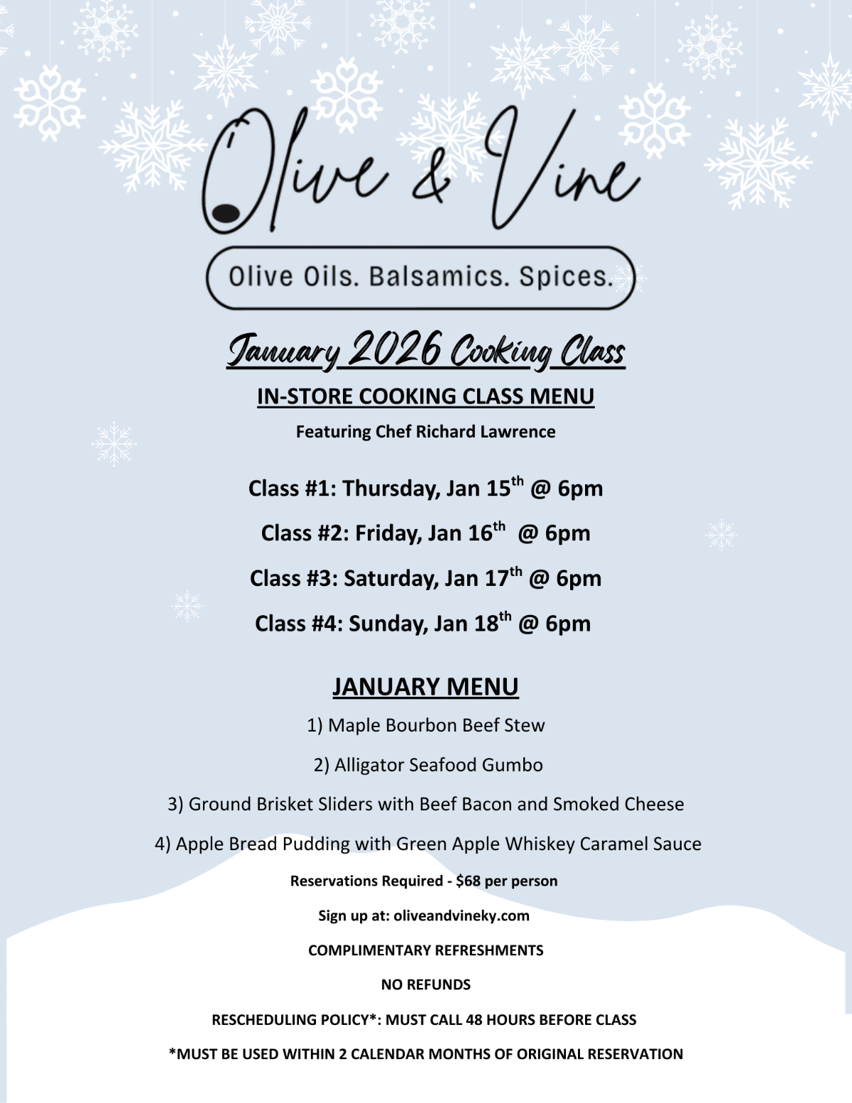In this cooking class, there are 12-14 stations, each designed for two participants. Each station will prepare one of the four courses featured on our menu. As we time the courses to be hot and ready simultaneously, the dishes will be plated and served family style, so you’ll enjoy a full plate of all four courses. Once everyone has finished dining, you’ll receive a recipe packet for all four dishes made that night. Additionally, you can purchase items, products, and gifts at the end of the evening. On the day of the class, arrival is between 5:30 PM and 5:45 PM. Upon arrival, you'll be able to choose which course you'd like to cook on a first-come, first-served basis.